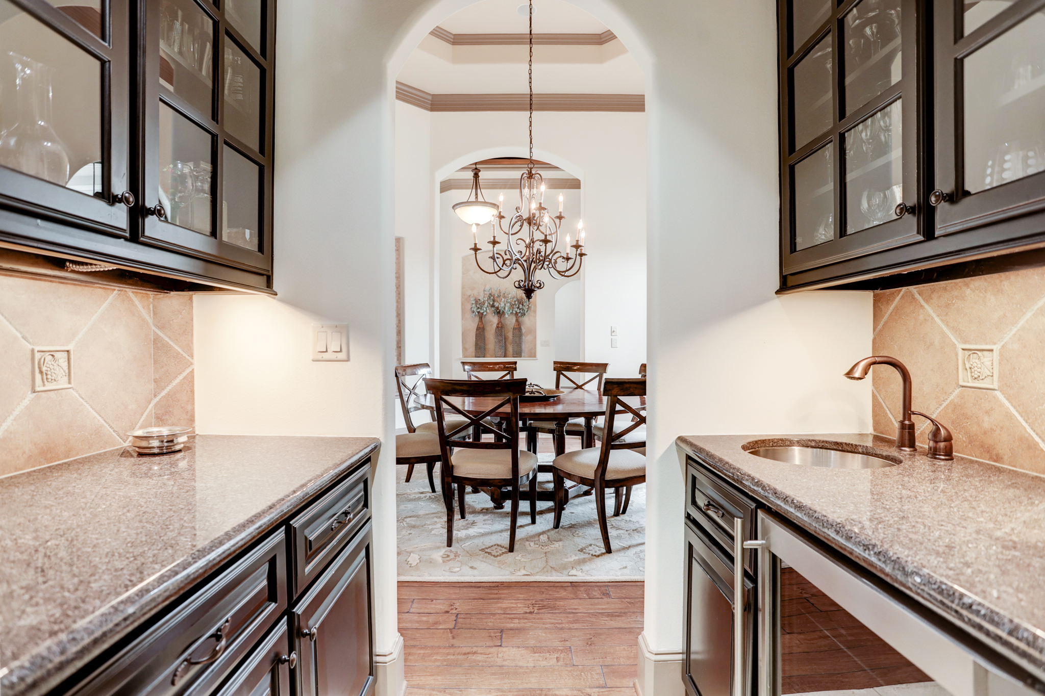 Two-story foyer with vaulted barrel ceiling leads to dining room with wine cellar and stunning living room with soaring ceilings and custom ivory Venetian plaster walls overlooking gorgeous private backyard pool retreat.